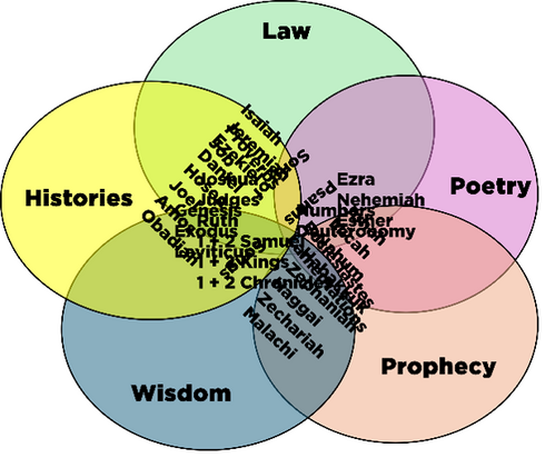 These are the classic genre divisions that we find within the Christian Bible; the 5 books of the law, the histories, the poetry (sometimes called the writings) and the prophets (both major and minor). However, if you have read many of these books you will know that these divisions do not even nearly tell the whole story.